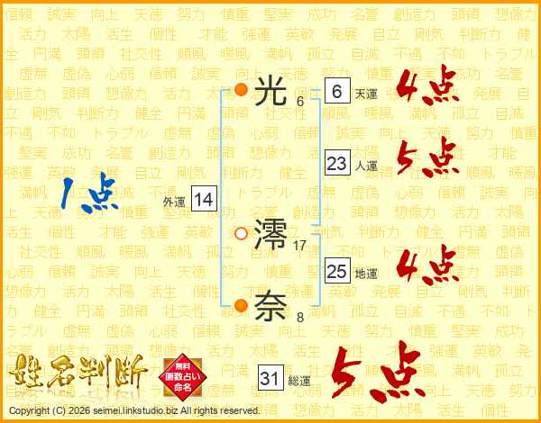 生活面を象徴する運勢です。外部から受ける影響力を表し、結婚運、家庭運や職場、環境への順応性を表します。総運から人運を引いた画数。姓や名が1文字の場合を除く。