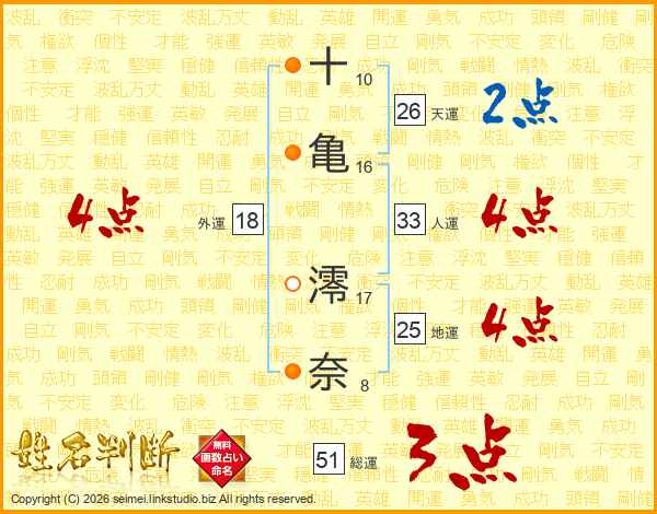 十(10画)亀(16画) 澪(17画)奈(8画)