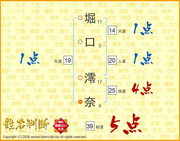 堀(11画)口(3画) 澪(17画)奈(8画)