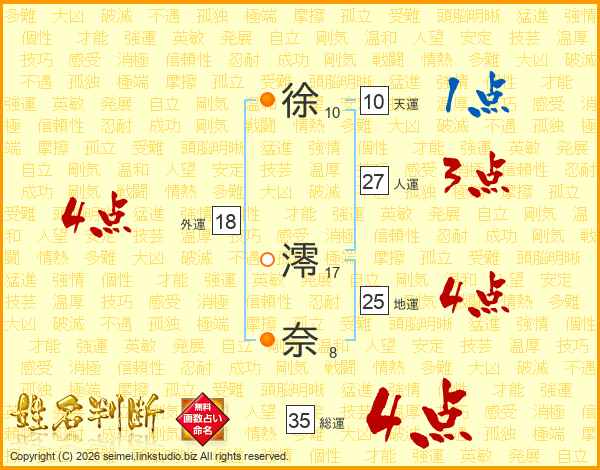 生活面を象徴する運勢です。外部から受ける影響力を表し、結婚運、家庭運や職場、環境への順応性を表します。総運から人運を引いた画数。姓や名が1文字の場合を除く。