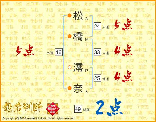松(8画)橋(16画) 澪(17画)奈(8画)