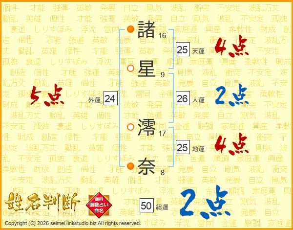 諸(16画)星(9画) 澪(17画)奈(8画)