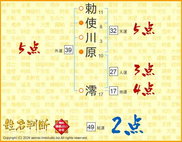 勅(11画)使(8画)川(3画)原(10画) 澪(17画)