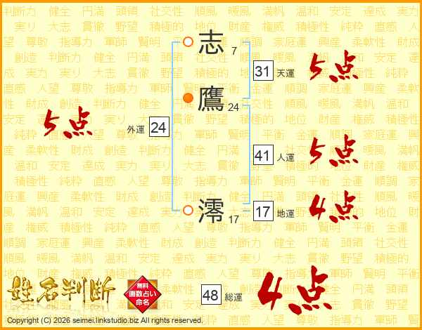 あなたの人生を表す1番重要な運勢です。生涯を通じて影響する総合運となり、主に50歳以降の晩年期に影響を及ぼします。苗字と名前の合計画数。