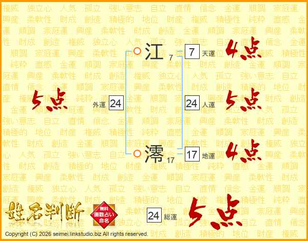 家系が持つ宿命的な運勢を表します。祖先から受け継いだ苗字ですので自分の力が及びません。家柄を象徴します。苗字の合計画数。