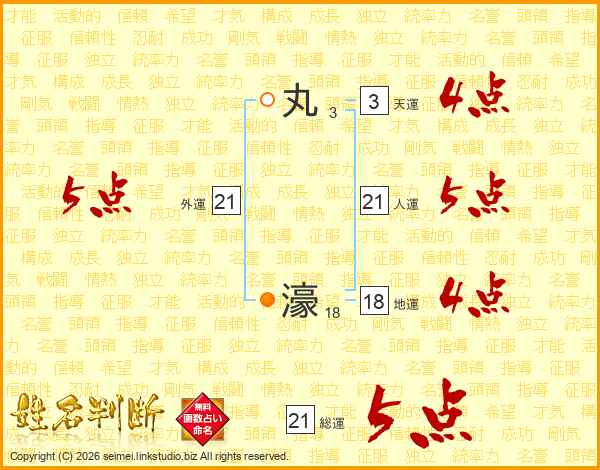 あなたの人生を表す1番重要な運勢です。生涯を通じて影響する総合運となり、主に50歳以降の晩年期に影響を及ぼします。苗字と名前の合計画数。