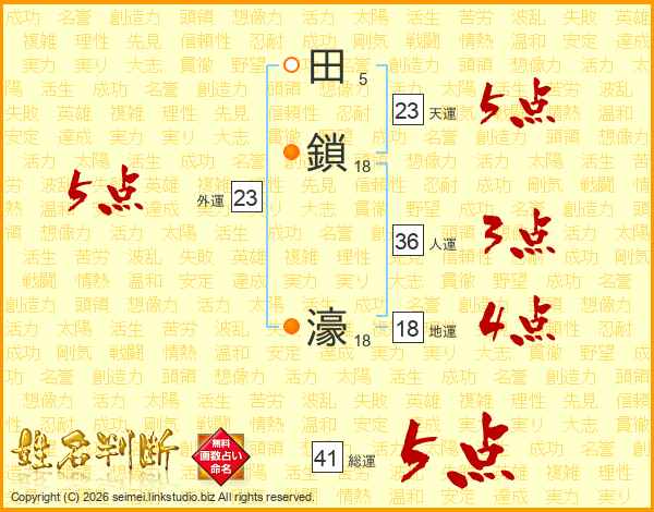 生活面を象徴する運勢です。外部から受ける影響力を表し、結婚運、家庭運や職場、環境への順応性を表します。総運から人運を引いた画数。姓や名が1文字の場合を除く。