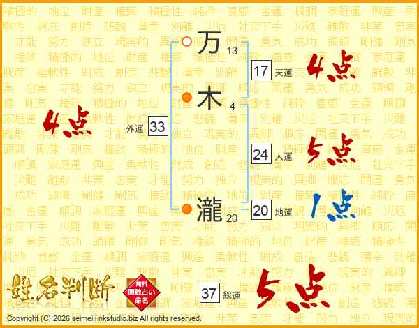 生活面を象徴する運勢です。外部から受ける影響力を表し、結婚運、家庭運や職場、環境への順応性を表します。総運から人運を引いた画数。姓や名が1文字の場合を除く。