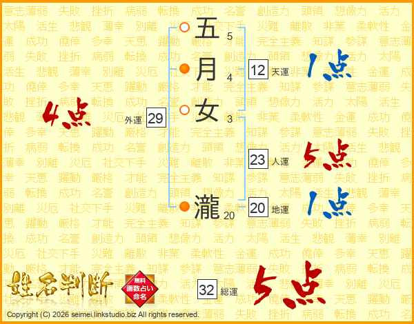 生活面を象徴する運勢です。外部から受ける影響力を表し、結婚運、家庭運や職場、環境への順応性を表します。総運から人運を引いた画数。姓や名が1文字の場合を除く。