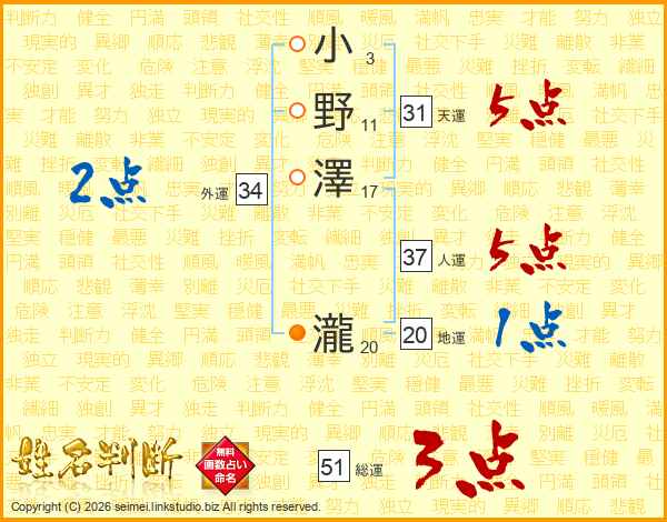 小(3画)野(11画)澤(17画) 瀧(20画)