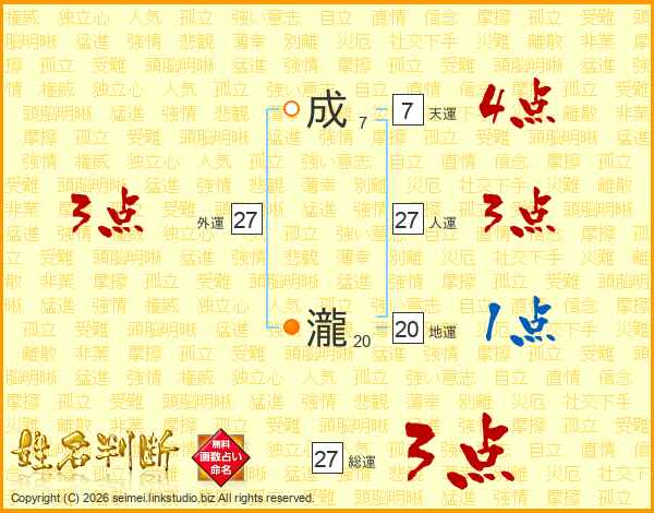 生活面を象徴する運勢です。外部から受ける影響力を表し、結婚運、家庭運や職場、環境への順応性を表します。総運から人運を引いた画数。姓や名が1文字の場合を除く。
