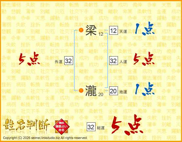 生活面を象徴する運勢です。外部から受ける影響力を表し、結婚運、家庭運や職場、環境への順応性を表します。総運から人運を引いた画数。姓や名が1文字の場合を除く。