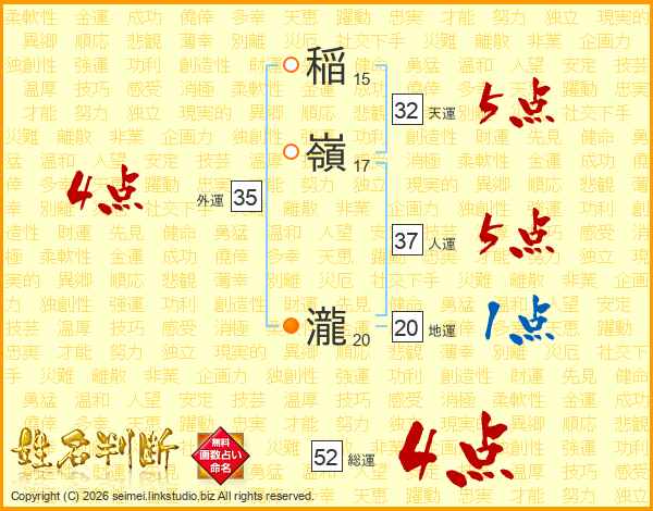 稲嶺瀧さんの総運は52画の4点!
