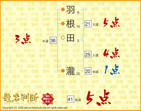 羽根田瀧さんの総運は41画の5点!