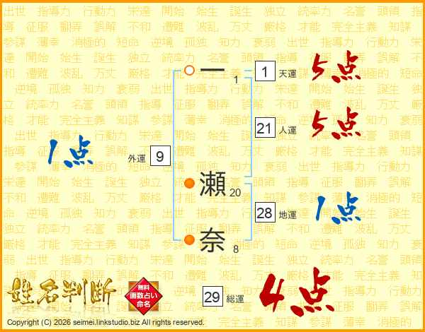 生活面を象徴する運勢です。外部から受ける影響力を表し、結婚運、家庭運や職場、環境への順応性を表します。総運から人運を引いた画数。姓や名が1文字の場合を除く。