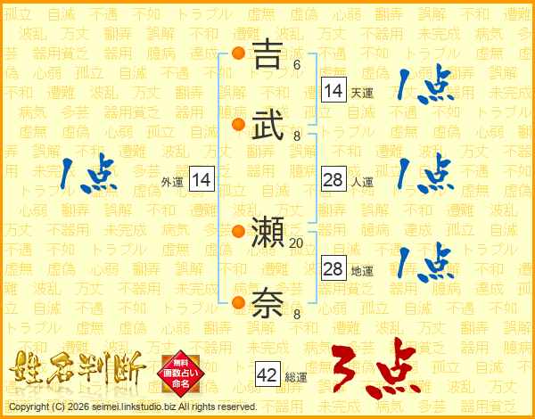 吉(6画)武(8画) 瀬(20画)奈(8画)