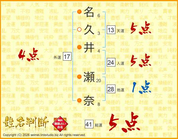 名(6画)久(3画)井(4画) 瀬(20画)奈(8画)