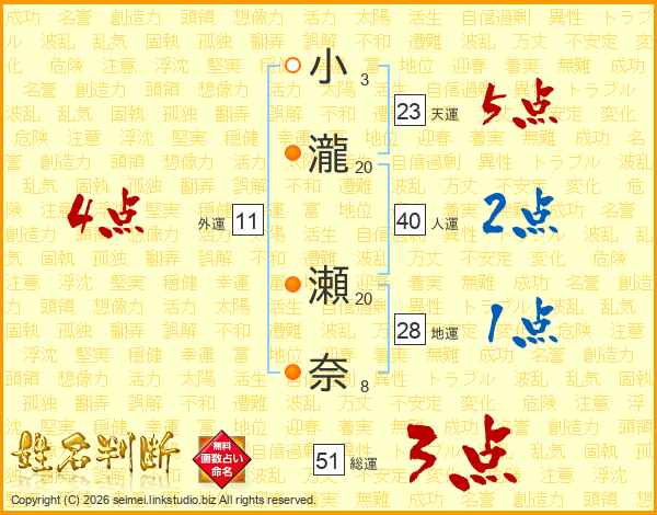 小瀧瀬奈さんの総運は51画の3点!
