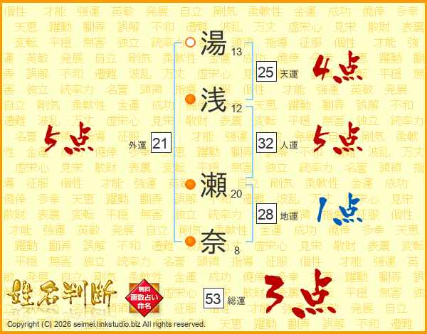 湯(13画)浅(12画) 瀬(20画)奈(8画)