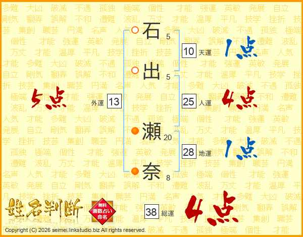 石(5画)出(5画) 瀬(20画)奈(8画)