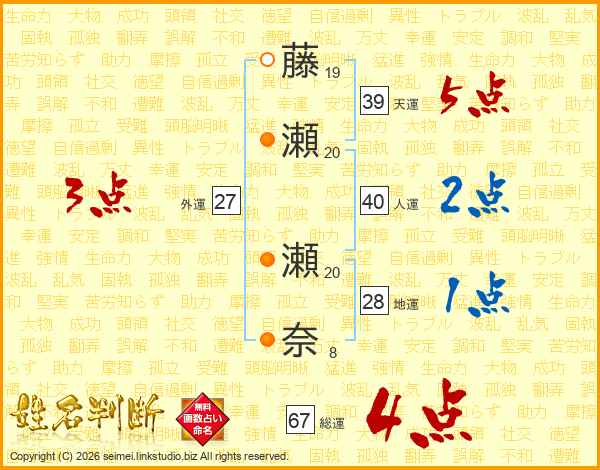 藤(19画)瀬(20画) 瀬(20画)奈(8画)
