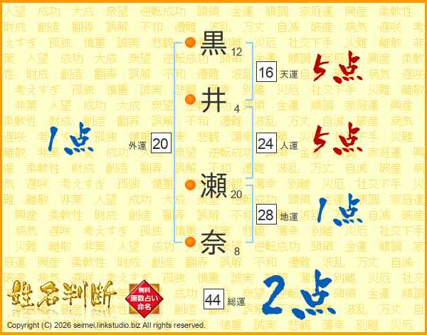 黒(12画)井(4画) 瀬(20画)奈(8画)