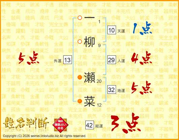 一(1画)柳(9画) 瀬(20画)菜(12画)