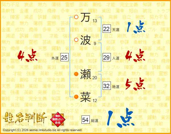 万(13画)波(9画) 瀬(20画)菜(12画)