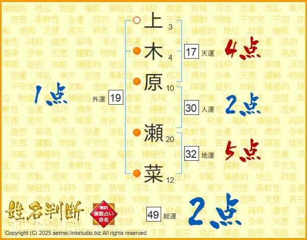 上木原瀬菜さんの総運は49画の2点!