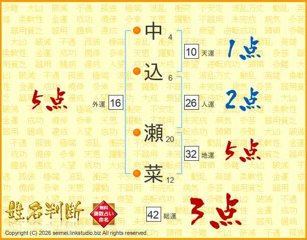 中込瀬菜さんの人運は26画の2点!