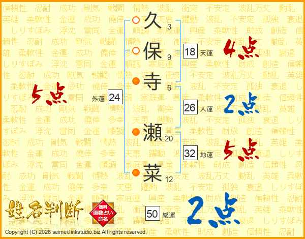 久(3画)保(9画)寺(6画) 瀬(20画)菜(12画)