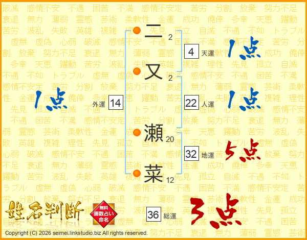 二又瀬菜さんの総運は36画の3点!