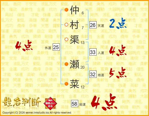 仲村渠瀬菜さんの総運は58画の4点!