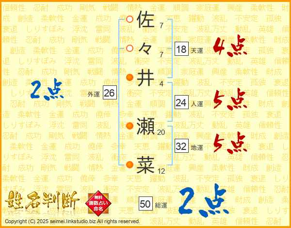 佐々井瀬菜さんの地運は32画の5点!
