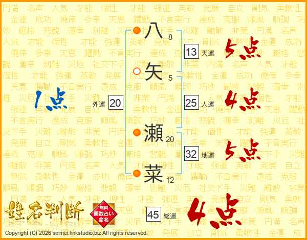 八(8画)矢(5画) 瀬(20画)菜(12画)
