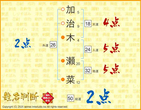 加(5画)治(9画)木(4画) 瀬(20画)菜(12画)