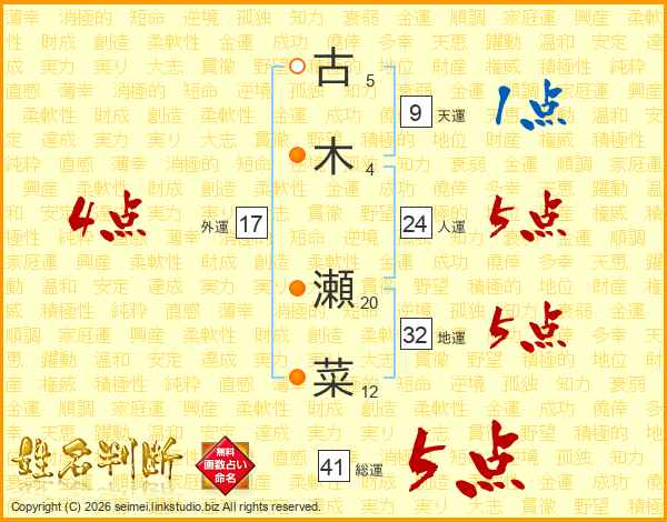 古(5画)木(4画) 瀬(20画)菜(12画)