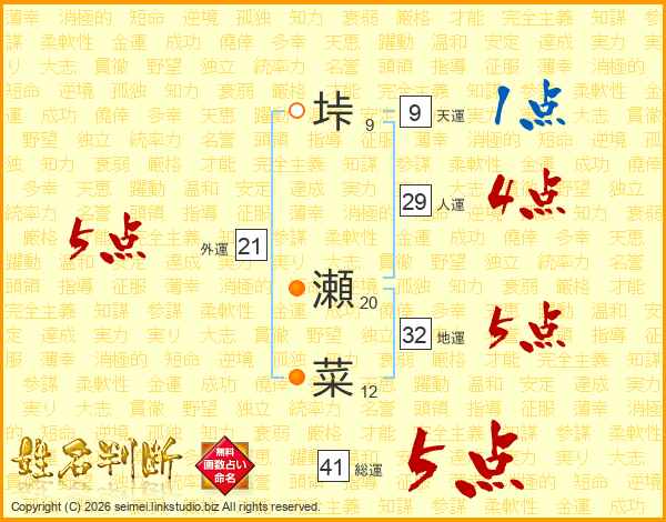 生活面を象徴する運勢です。外部から受ける影響力を表し、結婚運、家庭運や職場、環境への順応性を表します。総運から人運を引いた画数。姓や名が1文字の場合を除く。