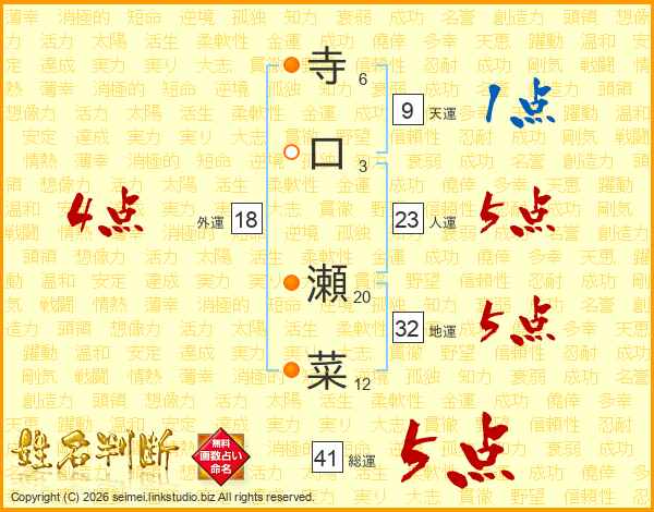 寺口瀬菜さんの総運は41画の5点!
