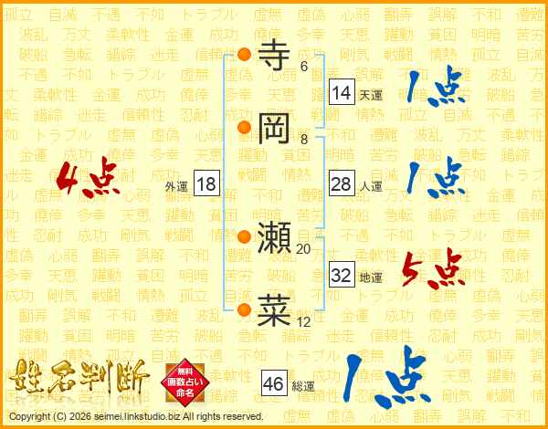 寺(6画)岡(8画) 瀬(20画)菜(12画)