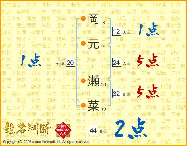 岡元瀬菜さんの総運は44画の2点!