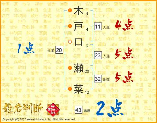 生活面を象徴する運勢です。外部から受ける影響力を表し、結婚運、家庭運や職場、環境への順応性を表します。総運から人運を引いた画数。姓や名が1文字の場合を除く。