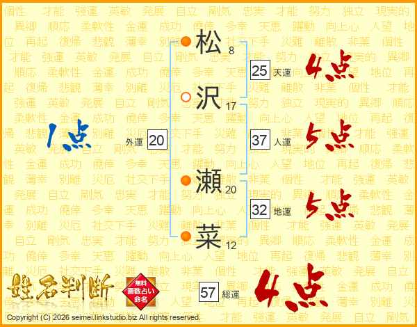 松沢瀬菜さんの総運は57画の4点!