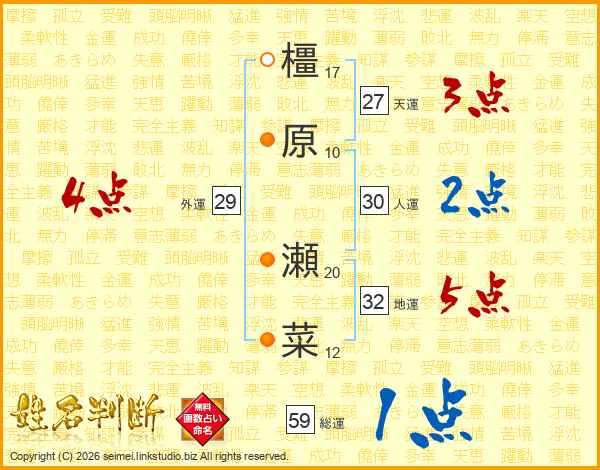 橿原瀬菜さんの総運は59画の1点!