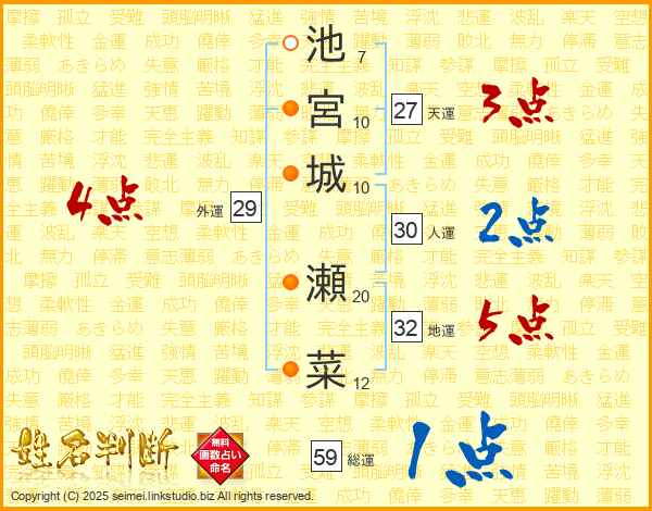 池(7画)宮(10画)城(10画) 瀬(20画)菜(12画)