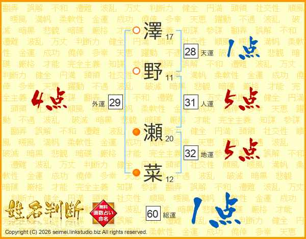 澤野瀬菜さんの地運は32画の5点!