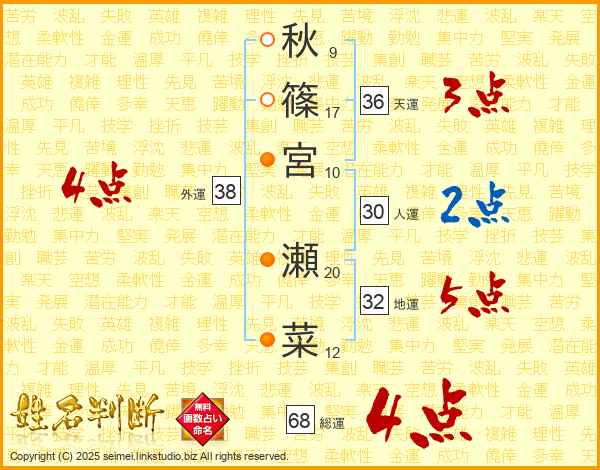 秋篠宮瀬菜さんの総運は68画の4点!
