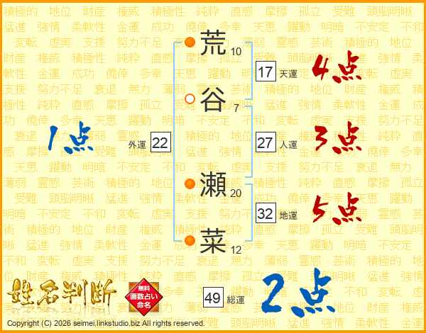 荒谷瀬菜さんの総運は49画の2点!