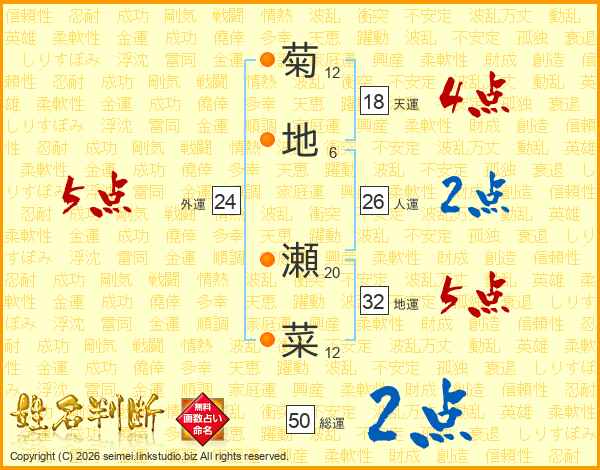 菊(12画)地(6画) 瀬(20画)菜(12画)