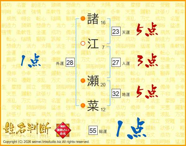 諸(16画)江(7画) 瀬(20画)菜(12画)
